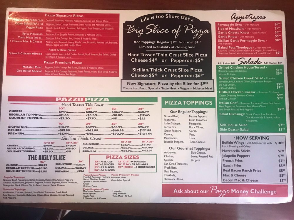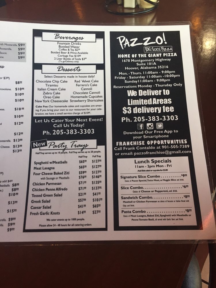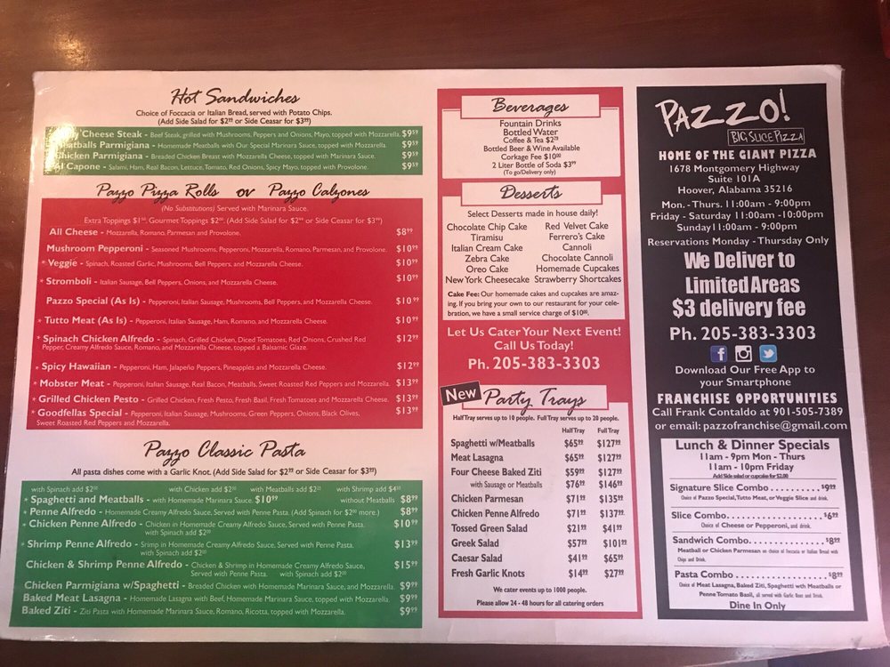 Introducing the menu at Pazzo! Big Slice Pizza, where indulgence meets novelty. Located in Hoover, Alabama, this Italian gem specializes in oversized pizza slices that are not only visually impressive but also delightfully tasty. Customers rave about the quality and rapid service, making it a favorite for lunch, dinner, and even catering for special occasions.